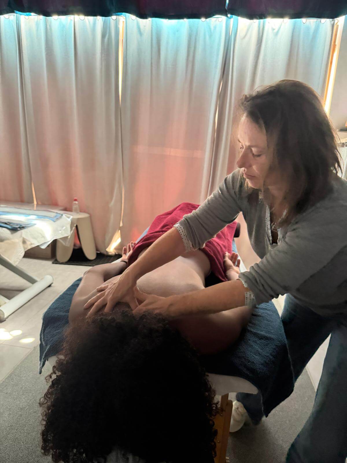 Je travaille les chaînes musculosquelettiques, et les points de tensions dans les différentes parties du corps, mais également sur les chaînes d’ouvertures et de fermetures ganglionnaires, la circulation sanguine et surtout lymphatique, l’abdomen et les terminaisons nerveuses.